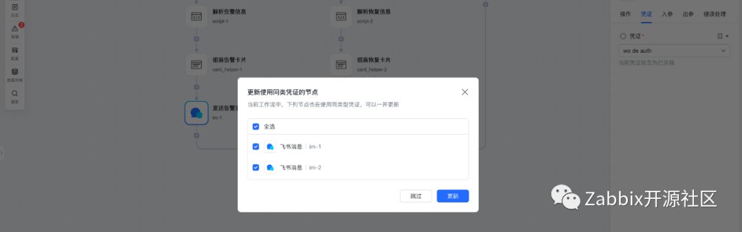 b.将创建的“飞书应用授权”凭证,批量更新到剩余的“飞书系”连接器节点。