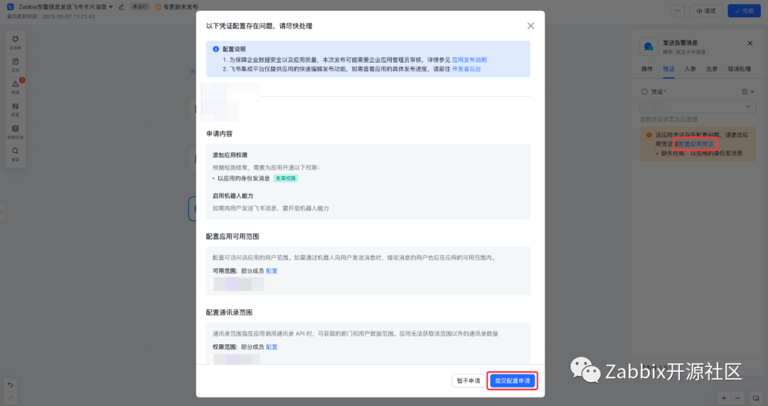 c. 选择好凭证后,如果该凭证需要额外申请权限,可在下提示信息中点击 配置应用凭证 ,一键提交配置申请。