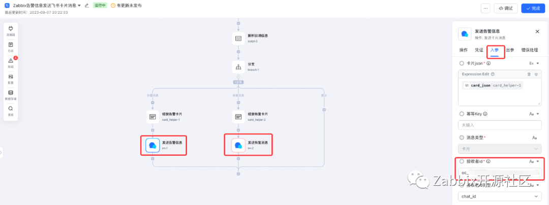 分别点击 发送告警信息/发送恢复消息 节点右侧的 入参,在 接收者id 字段填入需要接收信息的群id(群id的获取方式参考群 ID 说明 - 服务端 API - 开发文档 - 飞书开放平台)。