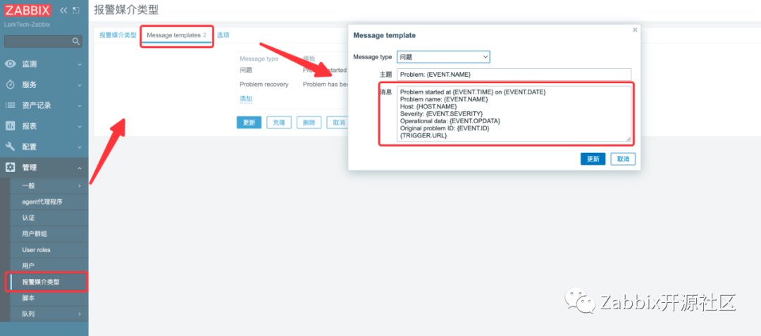 方式一:当前告警卡片中的告警信息取自Zabbix预置的宏{ALTER.MESSAGE},该信息支持用户在Zabbix的媒介及Action中进行定制。
