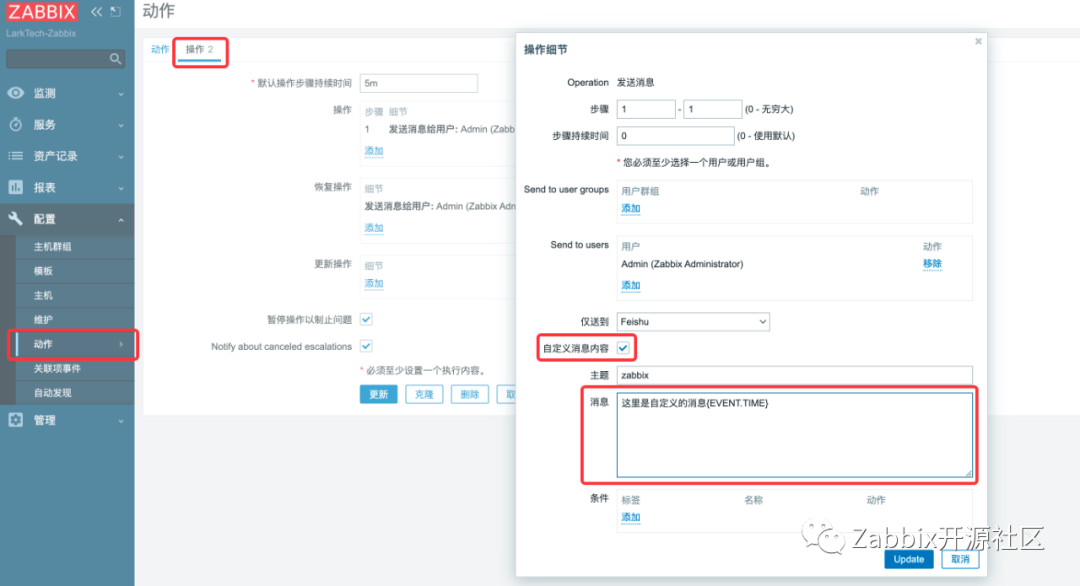 在action配置中选择具体的配置,选定操作,在操作细节中选择自定义消息内容,可以按照需求进行定制。