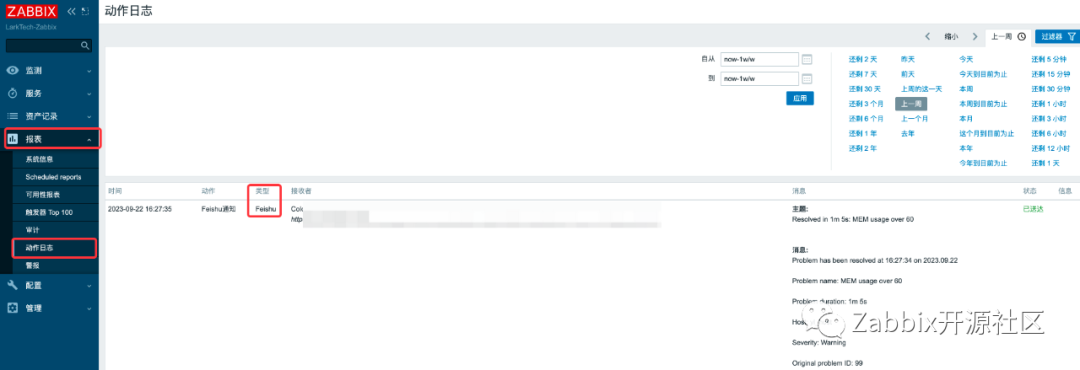 首先可以在zabbix的控制台的报表》动作日志中查看是否有相关发送给飞书的日志(如下图)。