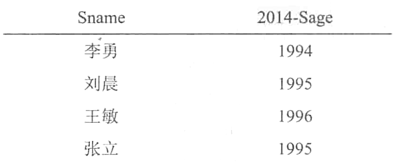 查询结果中第2列不是列名而是一个计算表达式,是用当时的年份(假设为2014年)减去学生的年龄。这样所得的即是学生的出生年份。输出的结果为