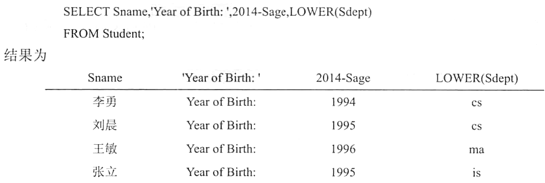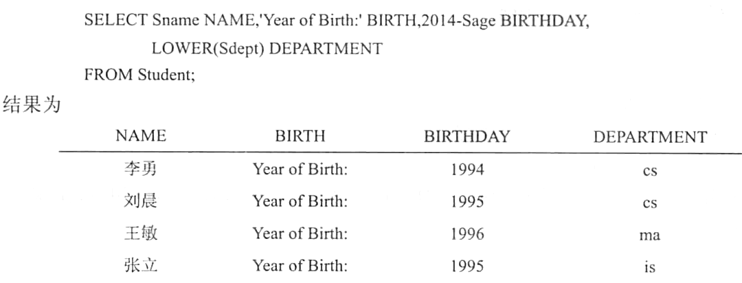 【例5】查询全体学生的姓名、出生年份和所在的院系,要求用小写字母表示系名。