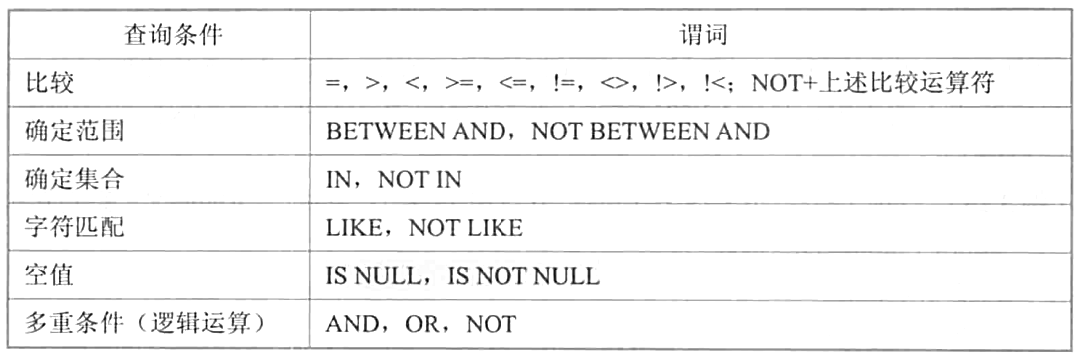 查询满足指定条件的元组可以通过WHERE子句实现。WHERE子句常用的查询条件如下表所示。