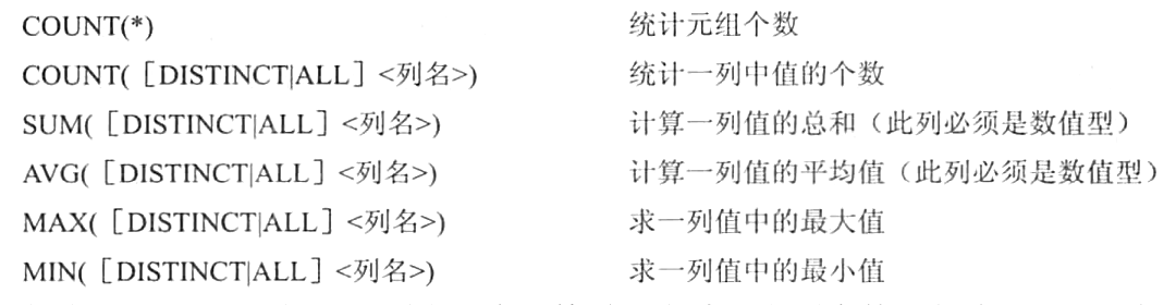 注意,WHERE子句中是不能用聚集函数作为条件表达式的。聚集函数只能用于SELECT子句和GROUP BY中的HAVING子句.