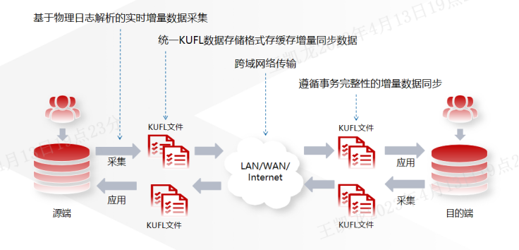 KFS的主要角色分为源端和目标端,其中源端连接源数据库,通过实时采集数据库的日志信息并解析处理,统一成以KUFL数据存储格式的物理文件。目标端通过网络连接到源端,不断获取由源端产生的KUFL文件,解析以后由目标端连接目标数据库,以遵循事务完整性的原则将数据写入到目标数据库中。而过滤器可配置在采集阶段或者应用阶段,以适用与不同的数据过滤场景。