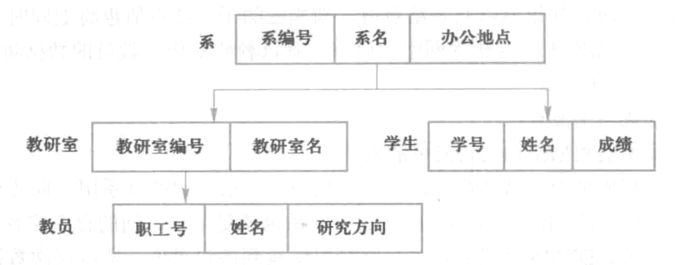 下图是一个教员学生层次模型。该层次模型有4个记录类型。记录类型系是根结点,由系编号、系名、办公地点三个字段组成。它有两个子女结点教研室和学生。记录类型教研室是系的子女结点,同时又是教员的双亲结点,它由教研室编号、教研室名两个字段组成。记录类型学生由学号、姓名、成绩三个字段组成。记录类型教员由职工号、姓名、研究方向三个字段组成。学生与教员是叶结点,它们没有子女结点。由系到教研室、由教研室到教员、由系到学生均是一对多的联系。
