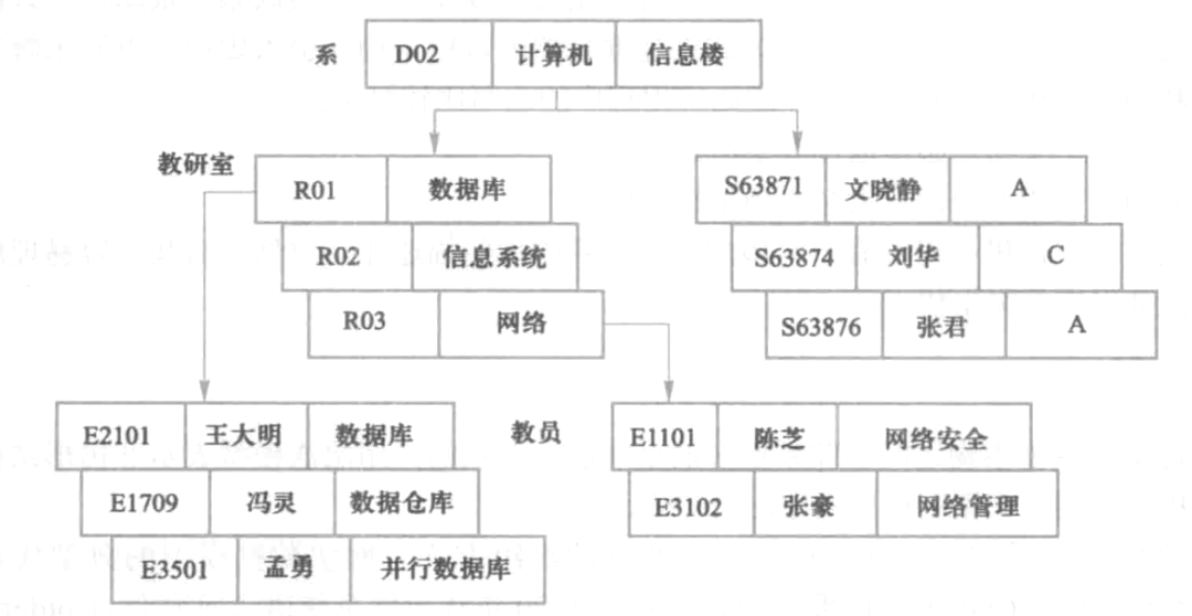 下图是上图数据模型对应的一个值。该值是D02系(计算机科学系)记录值及其所有后代记录值组成的一棵树。D02系有三个教研室子女记录值R01、R02、R03和三个学生记录值S63871、S63874、S63876。教研室R01有三个教员记录值E2101、E1709、E3501;教研室R03有两个教员记录值E1101、E3102。