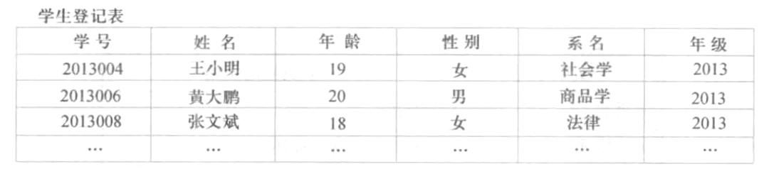关系模型与以往的模型不同,它是建立在严格的数学概念的基础上的。严格的定义将在第二章“关系数据库”中给出。这里只简单勾画一下关系模型。从用户观点看,关系模型由一组关系组成。每个关系的数据结构是一张规范化的二维表。下面以学生登记表(如下图所示)为例,介绍关系模型中的一些术语。