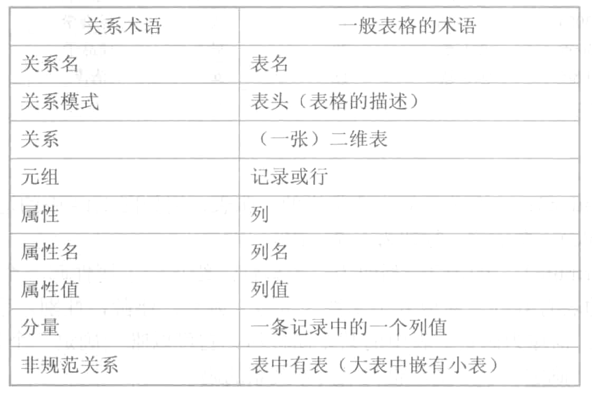可以把关系和现实生活中的表格所使用的术语做一个粗略的对比,如下图所示。