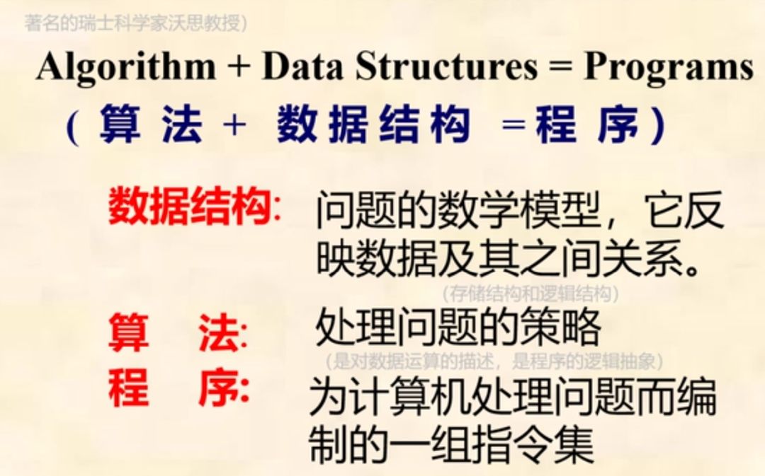 沃思(Niklaus Wirth)教授认为:程序是计算机指令的组合,用来控制计算机的工作流程,完成一定的逻辑功能以实现某种任务;算法是程序的逻辑抽象,是解决某类客观问题的策略;数据结构是现实世界中的数据及其之间关系的反映。