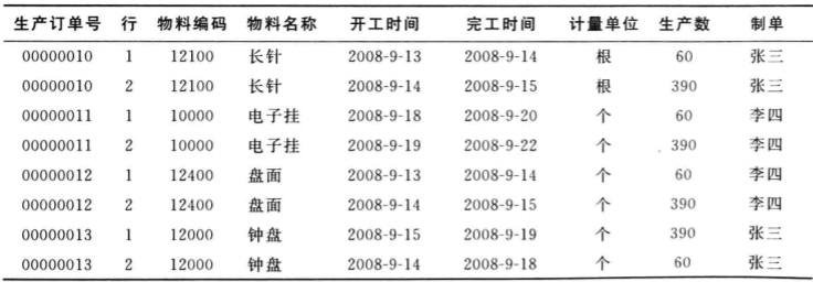 例如上表所示,其中“生产订单号”、“行”等是简单数据项,它们在数据处理时不能再分割;而“开工时间”、“完工时间”则是一个组合数据项,它可以进一步划分为“年”“月”和“日”等更小的数据项。
