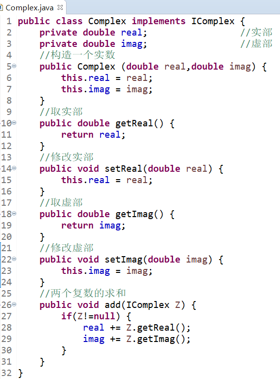 Complex类实现了IComplex接口中的5个方法,该类中还包括两个私有成员变量real、imag和1个构造方法。