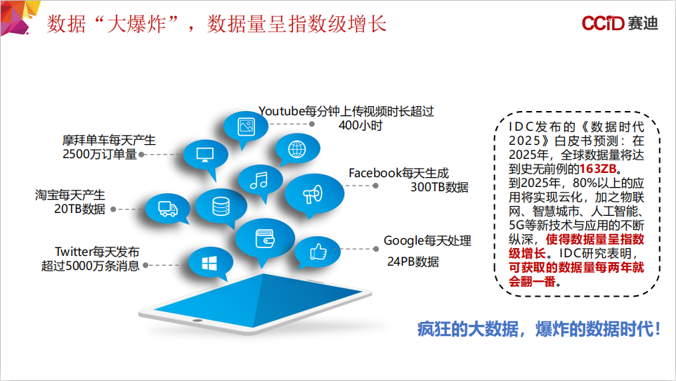 我们要如何看待数据这个话题。数据大爆炸已经成为了一个趋势,随着数字化转型的步伐逐步加快,数据的诞生不断加快。我们已经真正步入到一个大数据的时代。每个人每时每刻都在产生大量的数据,随着移动互联网的应用和传感网络的普及,我们的数据呈海量式增长,根据IDC发布的报告中统计,到2025年,全球的数据量将达到史无前例的163ZB。