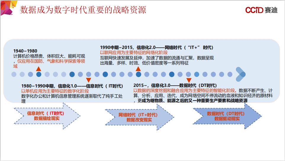 回顾数据发展的整个过程会发现,数据已经成为当代的战略性的资源。从上世纪四十年代到八十年代,由于计算机的昂贵、体积大、能耗高,往往只限于国防、气象、科研研究的一些领域。那时候一台计算机是有几个房子那么大,数据的存储量不是很高。而进入到了信息技术的1.0时代,也称为IT时代,这一时期是以单机应用为主要特征的数字化阶段,以数字化办公和信息管理系统逐渐代替纯手工数据,此时的数据仅限于办公等信息。信息化1.0阶段的特征是数据信息描绘(映射)现实。