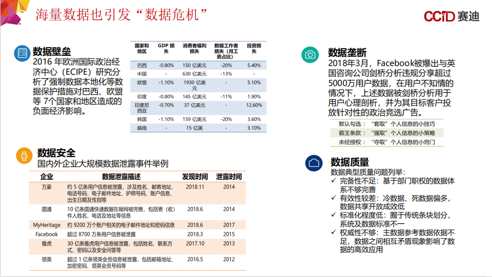一是数据壁垒森严。当前国际上普遍形成了一种各自本地化的要求,形成了一个数据壁垒。2016年欧洲国际政治经济中心(ECIPE)研究分析了强制数据本地化等数据保护措施对巴西、欧盟等 7个国家和地区造成的负面经济影响。