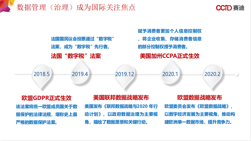 为此,各国都在将数据管理和治理看作重要的内容,这也成为全球关注的焦点。比如欧盟,发布了全球第一个最严格的数据法规——《通用数据保护条例》(GDPR);法国提出了“数据税”的探索;美国联邦政府将数据作为政府的联邦战略,以政府数据治理为主要视角,来提出了未来的联邦政府的数据的愿景和关键的行动计划;2020年2月,欧盟也发布了《欧盟数据战略》,以数字经济发展为主要视角,推动构建欧洲单一数据市场,提升竞争力。