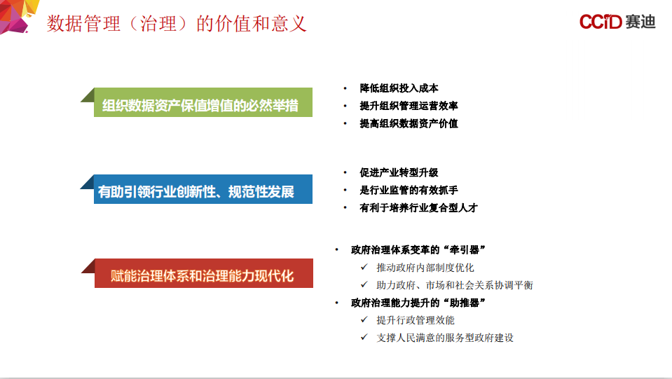 第一,是组织机构数字资产保值增值的必然举措。通过数据驱动来提高我们的运营效率,降低组织的投入成本,提升组织的管理过程。通过有效的组织管理来提升组织的资产价值,那么我们必须要按照资产的方式,将数据进行管理。