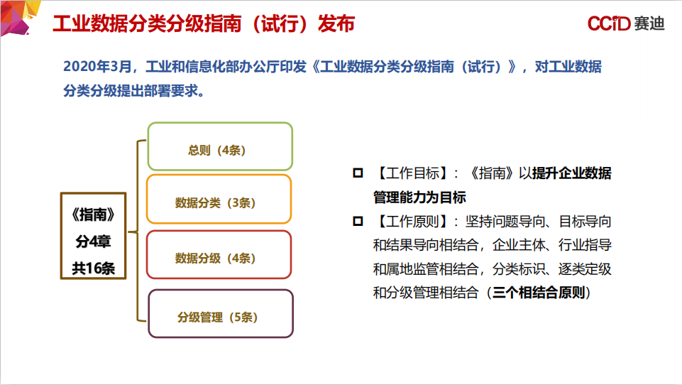 《指南》对工业数据分类分级提出了部署要求。指南分4章,共16条。指南总则部分是原则和目标,第二章围绕着数据分类有三条,第三章围绕着数据分级有四条,第五章围绕着分级管理有五条,《指南》以提升工业企业的数据管理能力为目标。