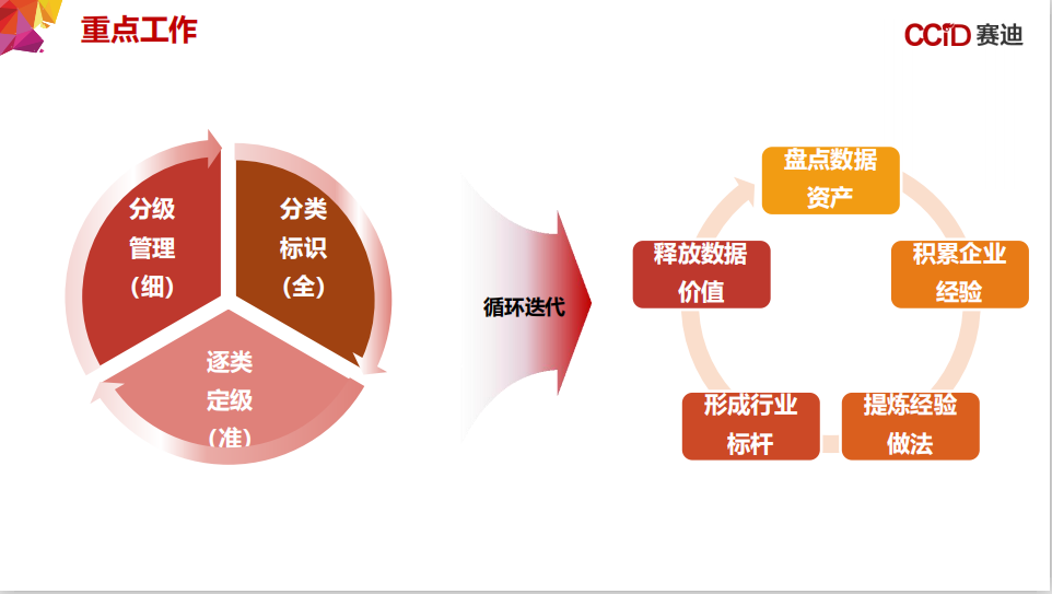 三是分级管理要细致到位。这样形成一个有效的闭环,把数据作为一个有效的过程来去做,通过试点积累的工作经验,提炼经验做法成为我们的方法论,培育行业标杆,通过他们现身说法,来进一步解释数据价值释放过程。