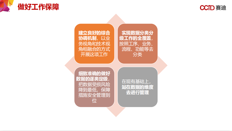 另一方面,要实现数据分类分级全覆盖,要按照工序,业务流程,功能等思考数据分类分级。同时,要细致准确的做好数据的逐类定级,要把数据的受损情况降低到最低,然后来评价每项数据的保护措施是否到位,这样才能够形成一个闭环。最后,要在现有的基础上,站在数据的维度上进行管理,进一步梳理数据,形成一个有机的管理体系。