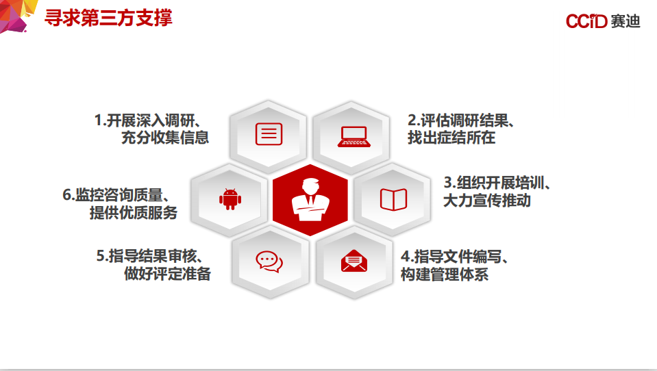 这里实际上要如何做好呢?很多企业还不会做的话可以寻找第三方的支持。第三方机构的支撑工作内容包括开展深入的调研,充分收集相关的信息;评估调研的结果,找到症结所在;组织内部的培训,加大方法的宣传;编制相关的指导文件,构建相关的管理体系;指导结果的审核,做好评定的准备;监控咨询的质量,提高优质的服务,这样才能够保证这项工作得到有效进行。