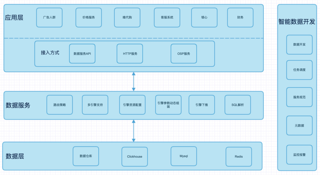 数据层:业务查询的数据无论在数仓、Clickhouse、MySQL 还是 Redis 中,都可以很好地得到支持,用户都使用同一套 API。
