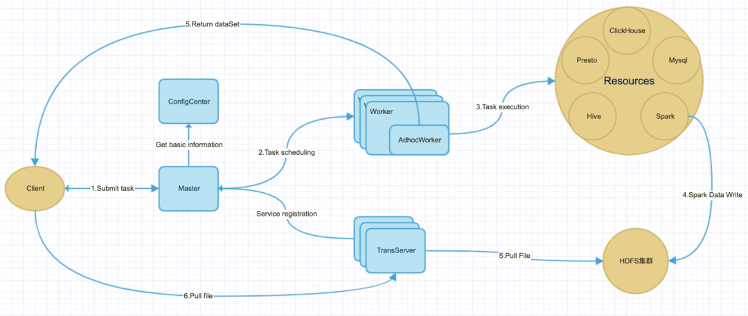 数据服务能给业务带来运营和商业价值,核心在于给用户提供自助分析数据能力。Hera整体架构基于典型的 Master/slave 模型,数据流与控制流单独链路,从而保障系统的高可用性。数据服务系统主要分为三层: