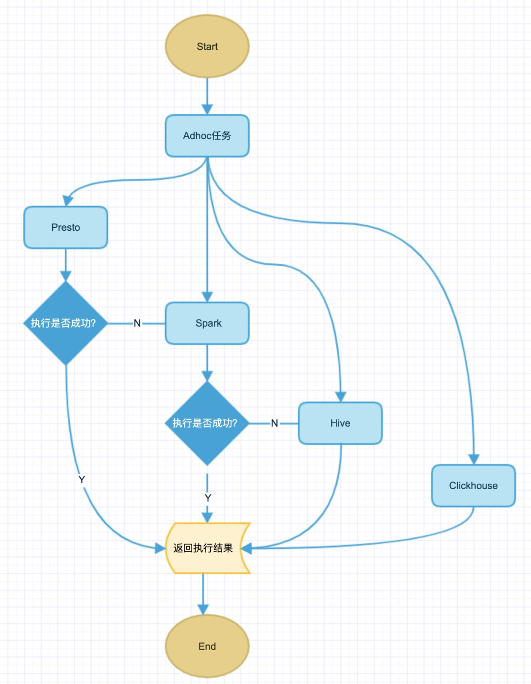 业务方在查询时,有可能因为引擎资源不足或者查询条件数据类型不匹配从而导致执行失败。为了提高查询成功率和服务 SLA 保障,设计了 Ad Hoc 自适应引擎执行,当一个引擎执行报错后,会切换到另外一个引擎继续执行。具体自适应执行逻辑如下图所示: