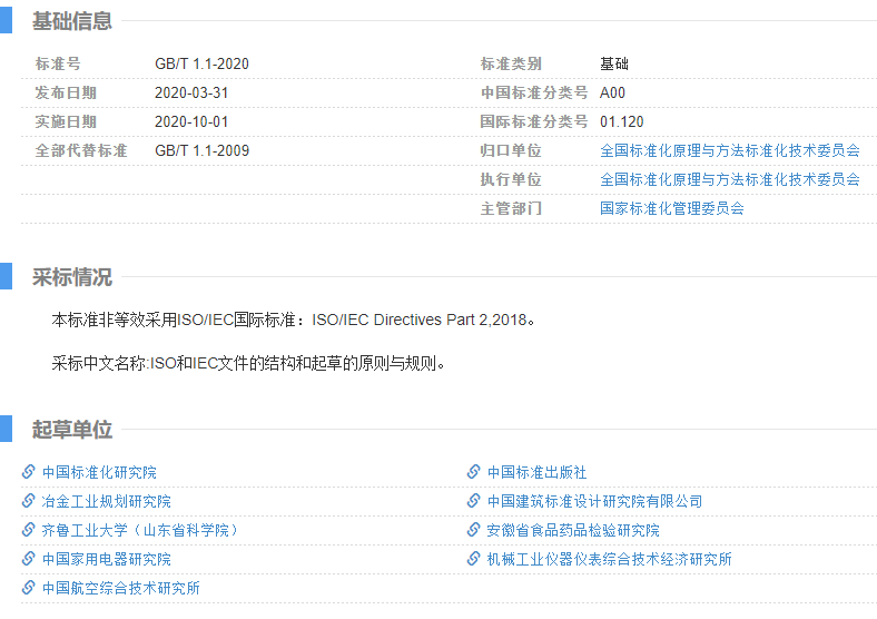 如果我们有写国家标准、行业标准的需求,除了内容上,文档格式方面的要求,也是非常有讲究,通常我们要参考的是GB/T 1.1,全称叫《GB/T 1.1-2020 标准化工作导则 第1部分:标准化文件的结构和起草规则》,这个是2020年最新修订的国家标准,从编号上,就可以知道这个标准很权威,可以说是"标准的标准",所以才给了1号,