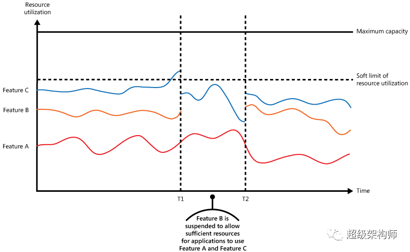 上图说明了延迟操作的影响。就在时间 T1 之前,分配给使用这些功能的所有应用程序的总资源达到阈值(资源使用限制)。此时,应用程序有耗尽可用资源的危险。在这个系统中,功能 B 不如功能 A 或功能 C 重要,因此它被暂时禁用并且它正在使用的资源被释放。在时间 T1 和 T2 之间,使用功能 A 和功能 C 的应用程序继续正常运行。最终,这两个功能的资源使用减少到在时间 T2 有足够的容量再次启用功能 B 的程度。