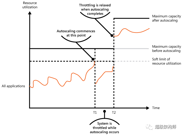 在时间 T1,达到指定资源使用的软限制的阈值。此时,系统可以开始横向扩展。但是,如果新资源没有足够快地可用,则现有资源可能会耗尽,系统可能会失败。如前所述,为防止这种情况发生,系统会暂时受到限制。当自动缩放完成并且额外的资源可用时,可以放松限制。