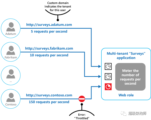 最后一张图说明了如何在多租户系统中实现节流。每个租户组织的用户都可以访问云托管的应用程序,并在其中填写和提交调查。该应用程序包含监控这些用户向应用程序提交请求的速率的工具。