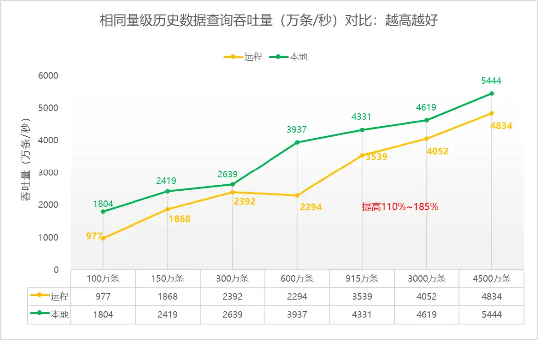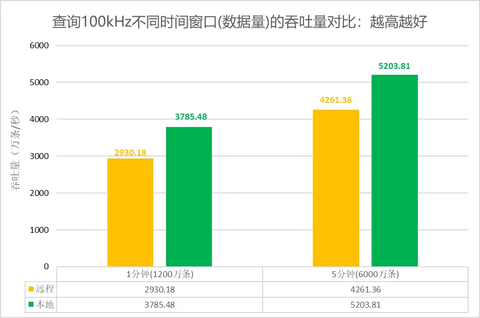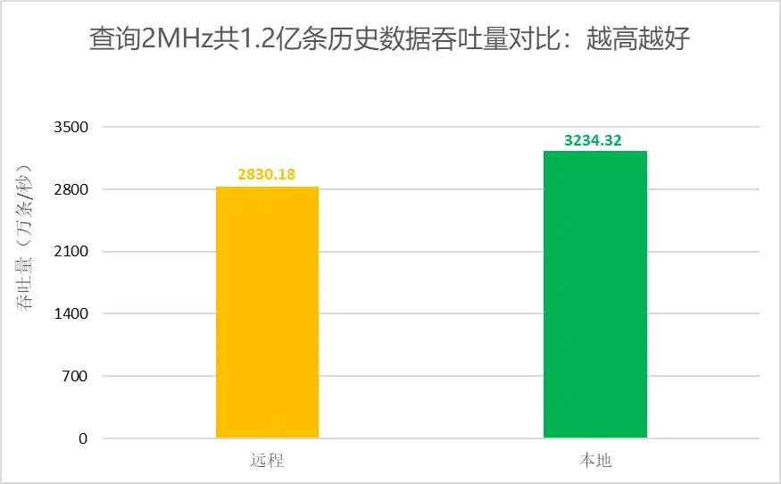 • 查询相同量级历史数据,本地网络环境不受网络带宽影响,本地网络环境的查询吞吐量为5444万条/秒,比远程网络环境的查询吞吐量提高110%~185%。