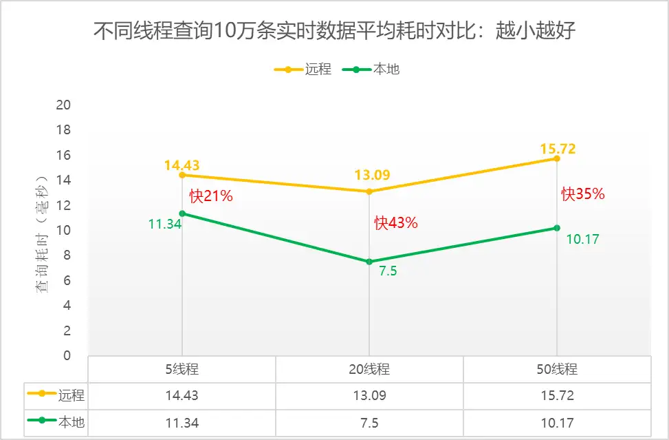 • 不同线程数查询10 万实时数据,纵坐标为查询耗时,本地网络环境平均耗时约10毫秒,比远程网络环境的查询耗时快21%~43%。