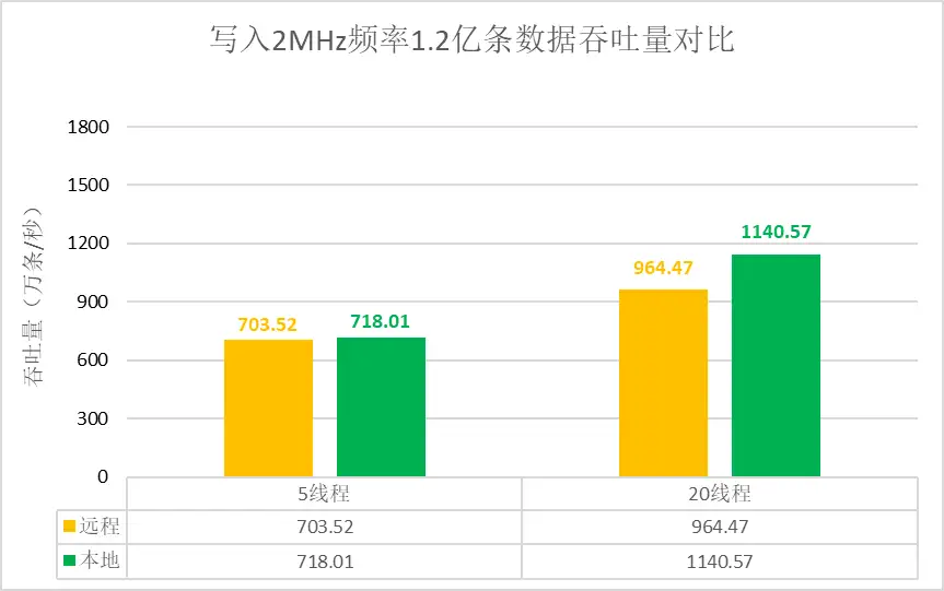 • 写入 2MHz 频率数据,远程网络环境5线程写入吞吐量达 703.52 万条/秒,20 线程写入吞吐量达 964.47万条/秒。本地网络环境20线程写入吞吐量高达 1140.57万条/秒,比远程网络环境的吞吐量提高59%。