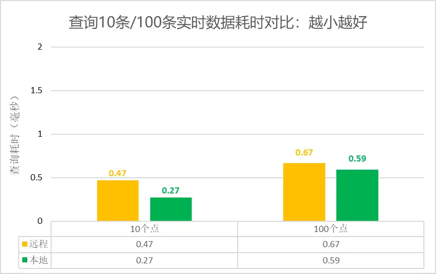 • 单个实时监控画面周期刷新10个点的实时数据仅需0.2毫秒的查询耗时,刷新100个点的实时数据仅需0.6毫秒的查询耗时。