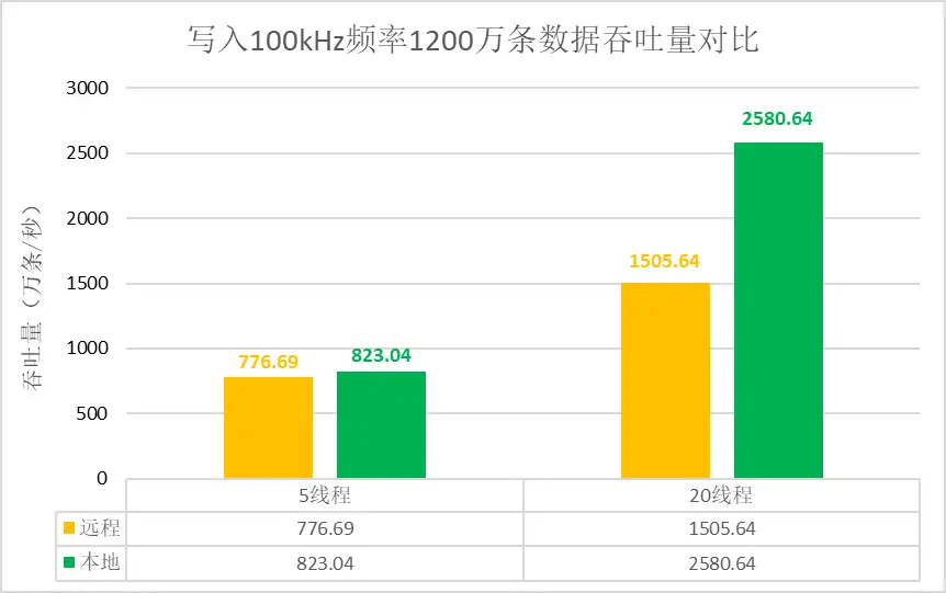 • 写入 100kHz 频率数据,远程网络环境5线程写入吞吐量达 776.69 万条/秒,20 线程写入吞吐量达 1505.64 万条/秒。本地网络环境20线程写入吞吐量高达 2580.64 万条/秒,比远程网络环境的吞吐量提高71%。