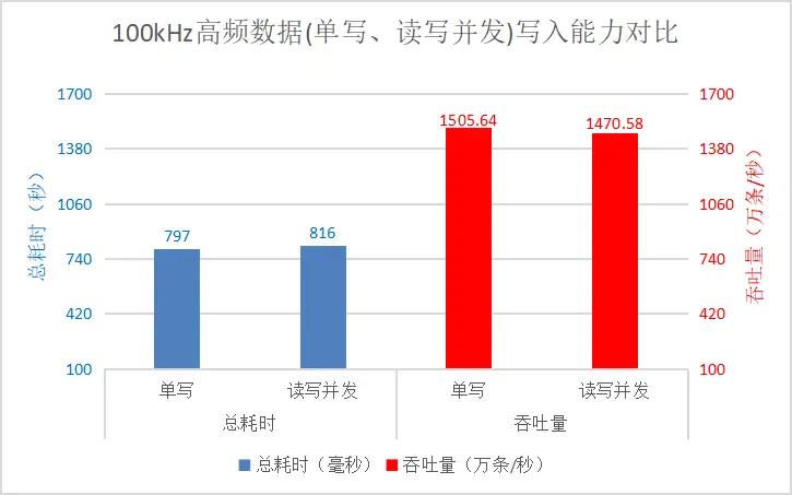 • 在读写并发情况下,数据库每秒可以处理 1470.58 万条数据的写入,相较于单写场景下的1505.64万条/秒吞吐量没有明显下降。
