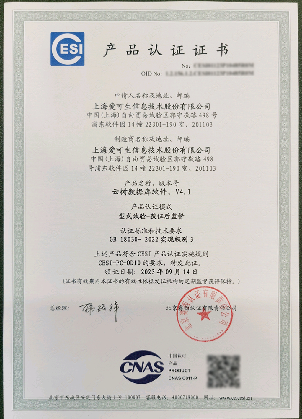 爱可生产品认证证书