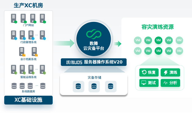 在该财政厅本地生产中心部署搭载统信UOS服务器操作系统V20的数腾国产化灾备产品,通过自动将灾备的重要数据恢复到灾备平台内,实现业务系统的仿真演练及灾备数据的可用性校验。当出现系统磁盘硬件故障或系统逻辑故障时,可以进行系统整机恢复,极大缩短了系统恢复的RTO,满足高效、稳定的数据备份管理的需求,实现全面保护。