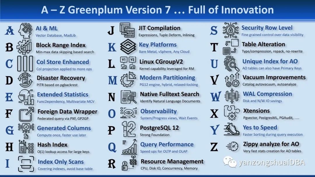 终于等到了GPDB7的发布,升级到了PgSQL12的内核,性能、功能有了大大的提升,看下新特性图: