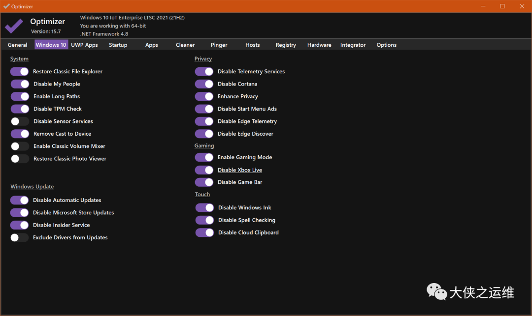 关闭Windows遥测、Cortana等: Optimizer 帮助用户关闭了一些可能会收集个人信息的Windows功能,增强了用户的隐私保护。