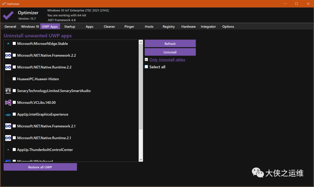 卸载UWP应用: 对于用户不需要的UWP(Universal Windows Platform)应用程序,Optimizer 提供了一键卸载的功能,确保系统不被这些应用程序拖慢速度。
