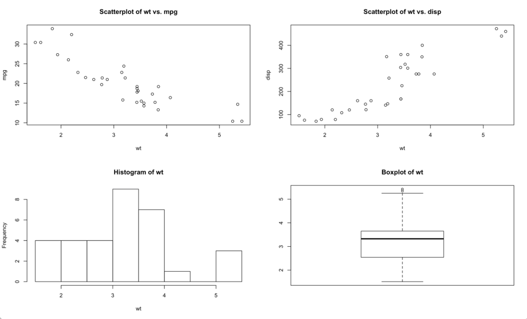 在函数par()和函数layout()的举例中,不可避免的使用到了散点图、条形图、箱线图等图形的绘制,这些内容也会在本次推文中提到,图形组合中的几个例子算是先给大家热热身。