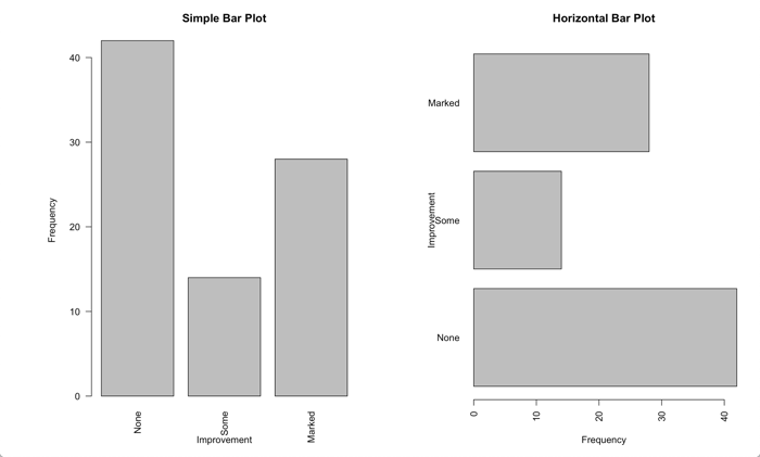 条形图通过垂直的或水平的条形展示了类别型变量的分布(频数),在R中对应函数 barplot()。下面是几个简单的例子。