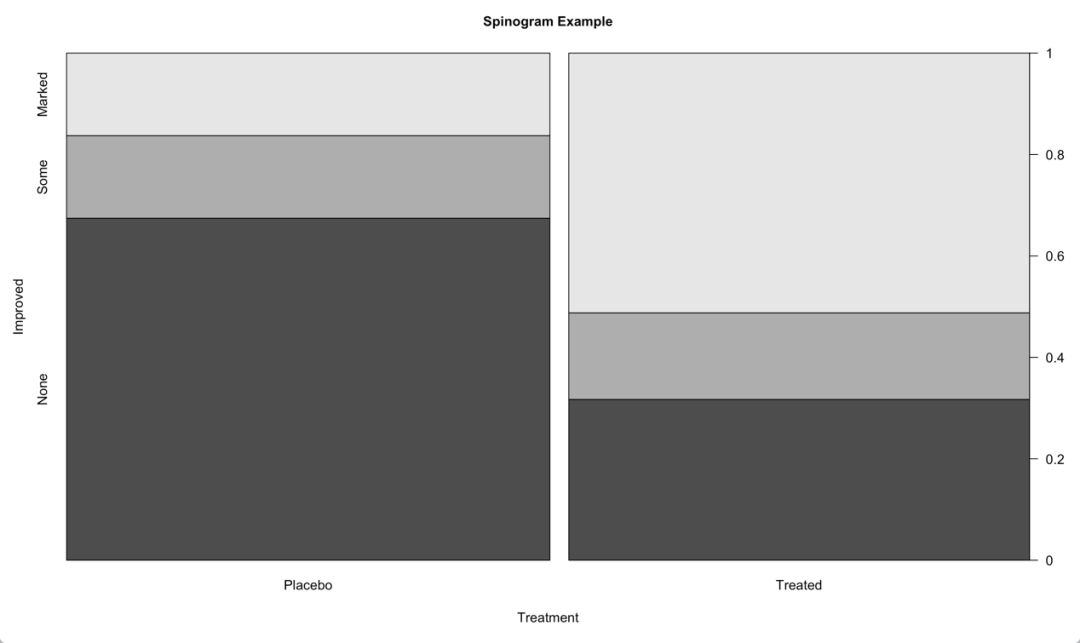 还有一种特殊但常见的条形图:棘状图。棘状图对堆砌条形图进行了重缩放,这样每个条形的高度均为1,每一段的高度即表示比例,可以通过vcd包中的函数spine()绘制。例子如下: