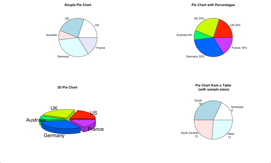 相比于条形图,饼图或者扇形图在R中不太受欢迎,因为我们对长度的比较总是比对面积的比较要更加敏感。即便如此,我们要为大家提供了一些饼图的实例。主要涉及函数 pie()、函数 pie3D()、函数 fan.plot()。