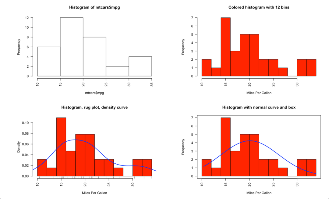 第一幅图形就是最简单的直方图绘制,余下的三幅图都是在函数 hist() 中调整参数或者加上其他元素而绘制的图形,其中第三、四幅图形中加上了密度曲线(在后面会进一步介绍),这是很常见的处理方式。